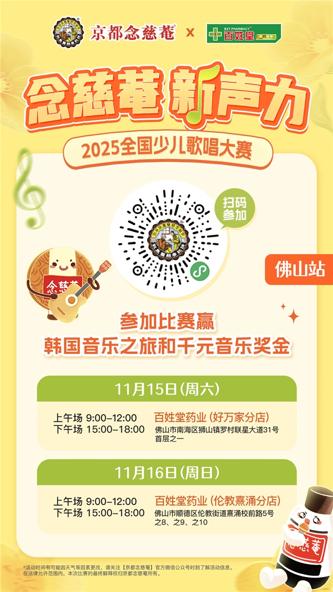 “念慈菴·新声力”全国少儿歌唱大赛可以通过线上和线下两种方式参与海选。线下海选覆盖全国 25 座城市,让热爱音乐的小朋友在家门口就能轻松圆梦!本次佛山站联合百姓堂药业,我们把舞台搬到你的身边!无需提前预约,药店门口即可直接报名参赛,一展歌喉。家长拍摄孩子唱歌视频作品上传小程序,即视为成功参赛。勇敢站上舞台的每位小选手,都能获得京都念慈菴精心准备的定制礼品!我们更鼓励家长全程陪伴,用镜头定格孩子第一次登台的紧张与雀跃,让这场音乐之旅成为亲子共成长的珍贵回忆。